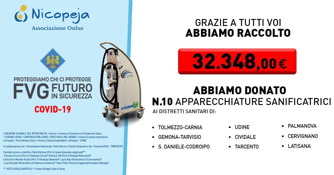 La Nicopeja, collettore della raccolta fondi, in accordo con la Direzione Generale dell’Azienda Sanitaria Universitaria del Friuli Centrale ha utilizzato la cifra raccolta per l’acquisto di dieci macchinari per la sanificazione, da impiegarsi per il contenimento della diffusione del virus COVID 19.